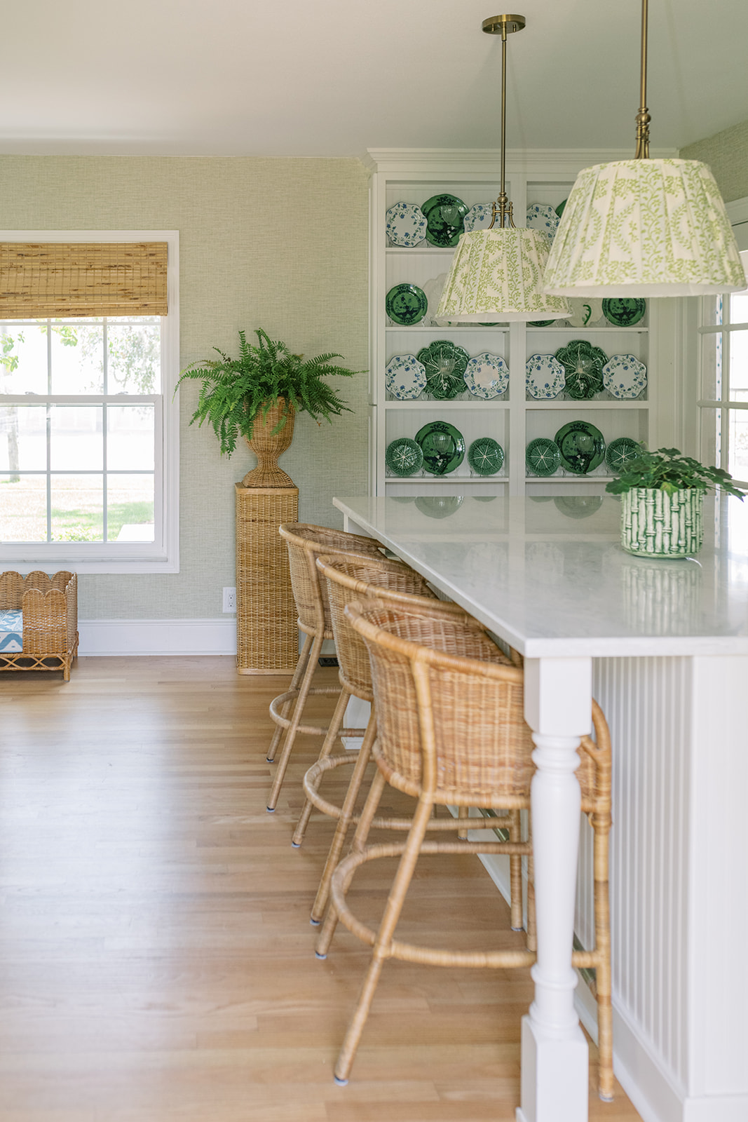 I used Dolly from Sister Parrish throughout. On the pendants, sconces, and pillows. I went with their “lettuce” color as it also has specs of cornflower blue that I also have in the room.Â