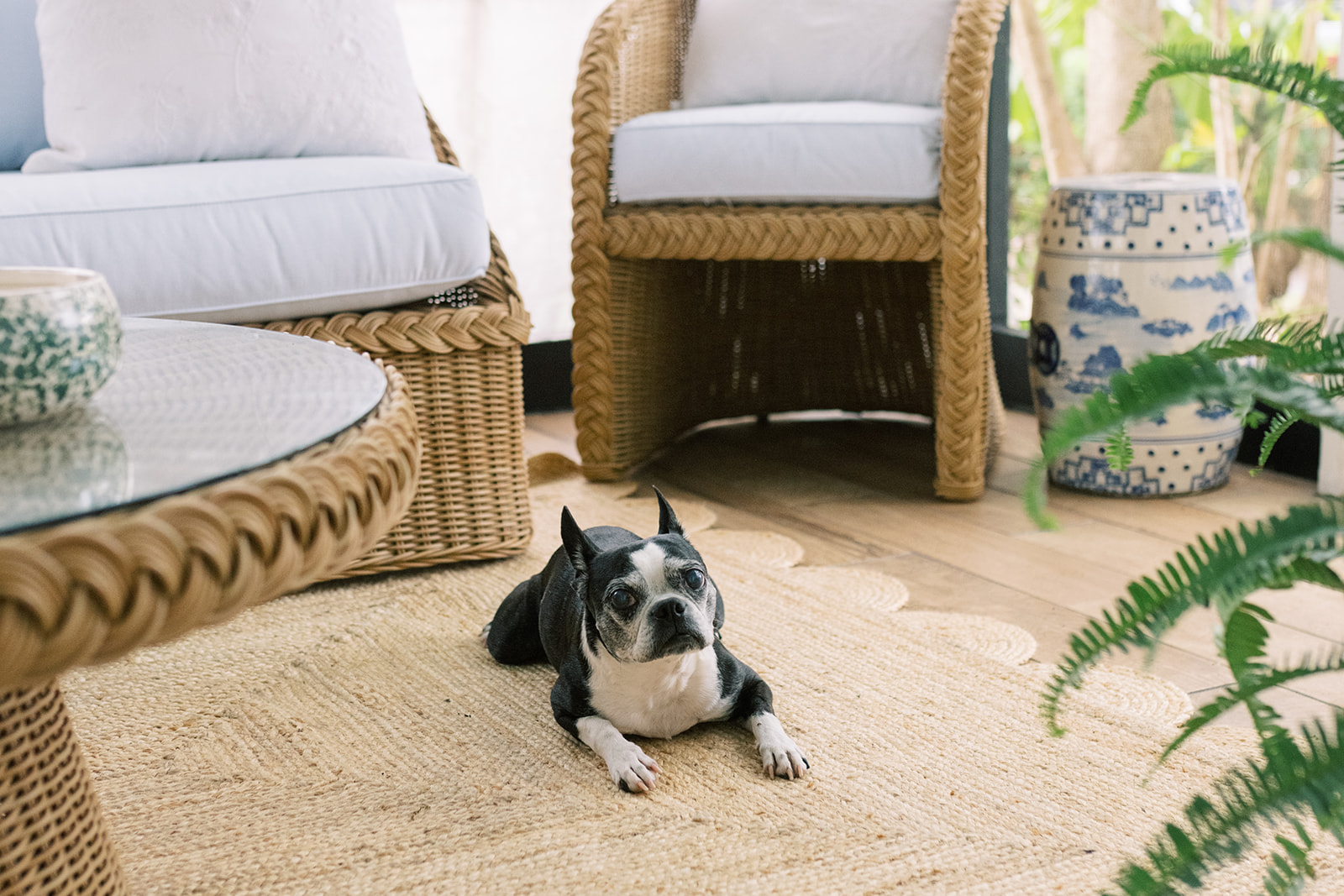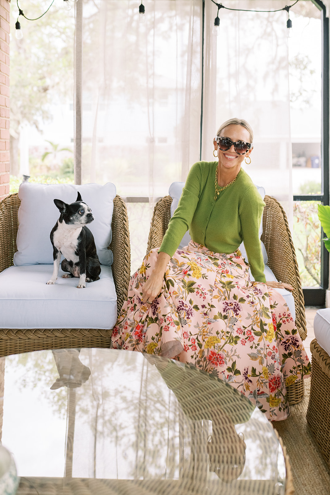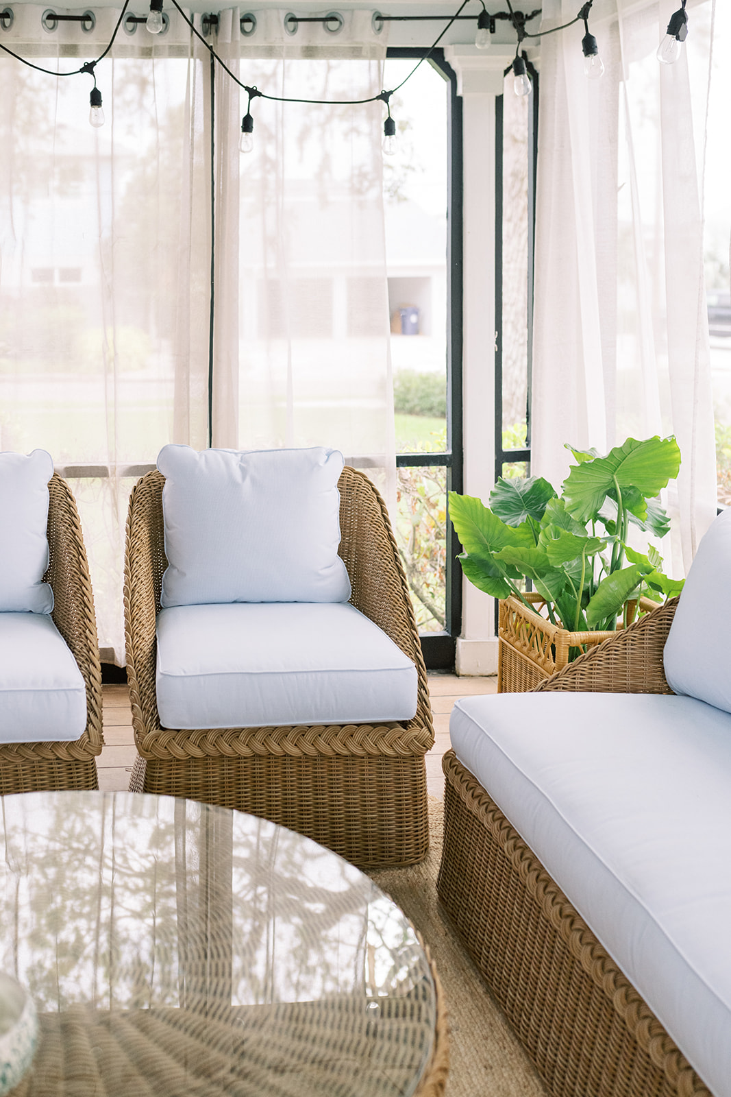 One of the things I fell in love with our house over ten years when we looked at it the first time, is this sleeping porch off of the living room. The Haint Blue ceilings with beadboard, the brick and the screened in porch. It was and is dreamy! There’s really no better spot, especially on a nice night. It was a lounge area when we looked at the house, they even had a tv out here. While we haven’t put a tv here… yet! It’s had many different eras. Most recently we had our porch bed swing, and a four top outdoor table. While we loved to eat out there, have an after dinner glass of wine, or a family night here … It felt cramped. It just didn’t feel 100% right. Now that we have the Williams Sonoma x Aerin West Hampton collection in place here, we can’t get enough of the space. I feel like we added another room to our house, since we are using it so much now. Â
