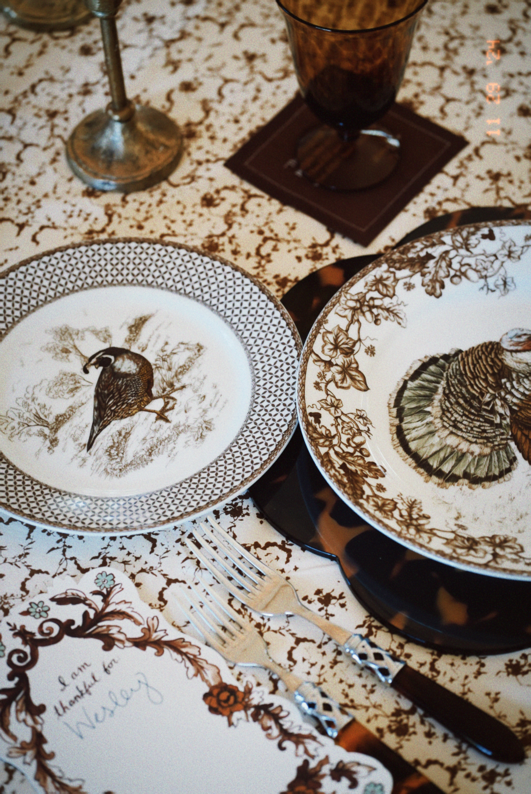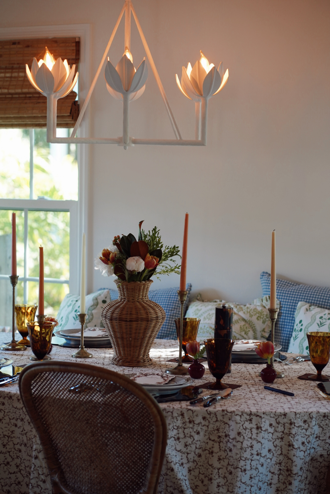 I always like to set the table in advance. My mom and sister came over, and we did this together. I had us eat around the kitchen island the night before instead of the table. It felt nice having that finished, so I could focus on other tasks. I set the table using this pretty Plymouth pattern from Williams Sonoma. Â