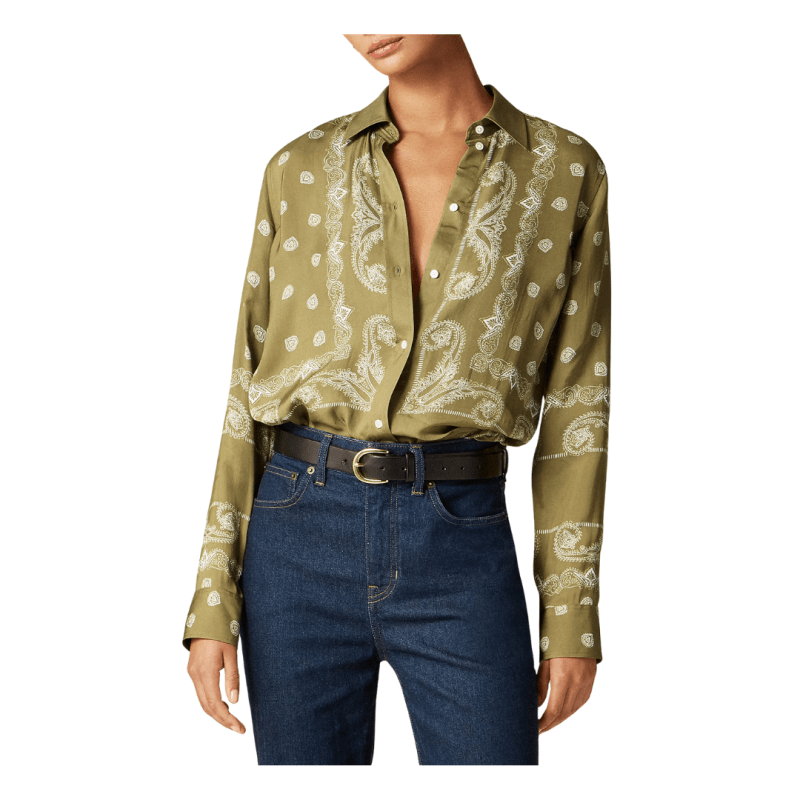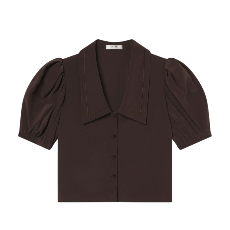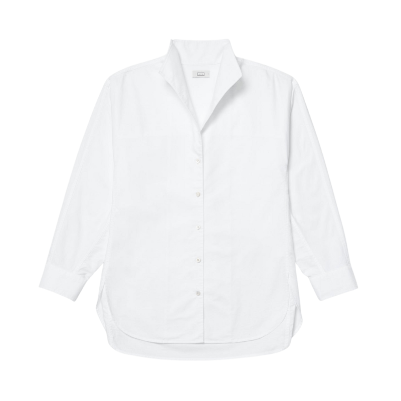 I love the details on this silk blouse — subtle polka dots, an elegant high neck, and a bow that ties in the back. It pairs beautifully with jeans or skirts, depending on the look you’re going for.Classic Button-Down Shirt