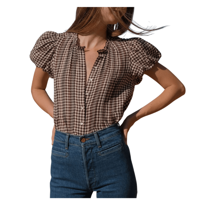 I love this easy, breezy brown gingham top. It looks especially chic layered under a cardigan draped over your shoulders, making it a versatile addition to your fall capsule.