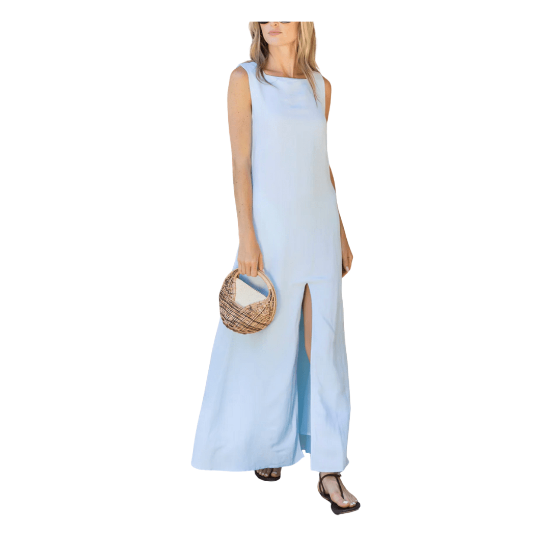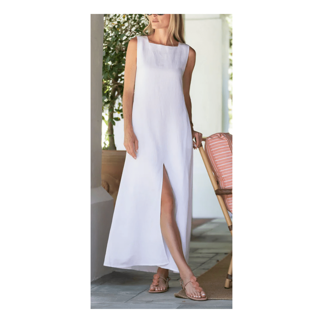 I love the classic cut of this chic white maxi dress. The slit adds such a fun touch! This is another style that I’ve reviewed and shared sizing details about in my Julia Amory blog post.