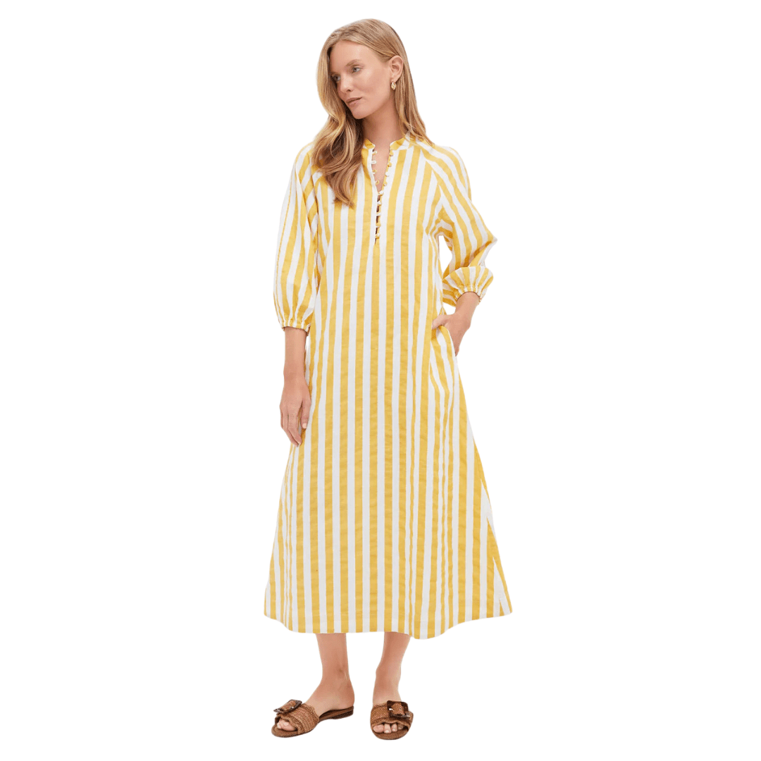This yellow striped caftan has been a best seller for two months in a row, and it’s a favorite of mine as well. It’s so comfy. There are only a few sizes left!