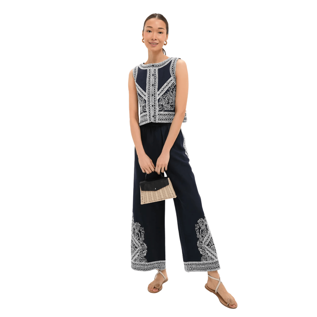 This navy and white embroidered top and pants set is SO good. Not only is it perfect for late summer, but you could also drape a sweater and wear it in early fall.