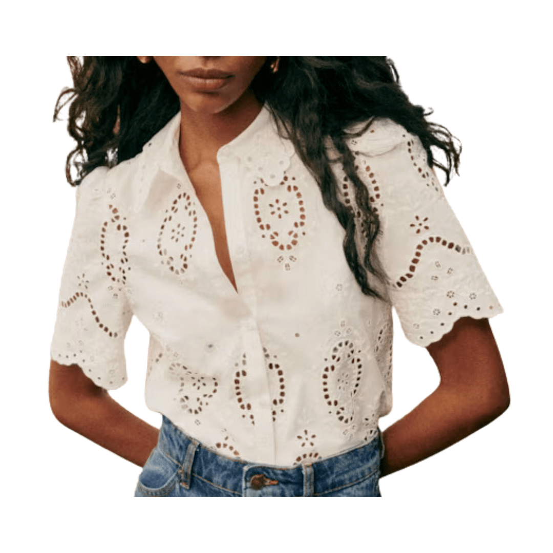 The details on this blouse are incredible. Such a beautiful mix of embroidery and scallops! Also comes in a pretty pink.