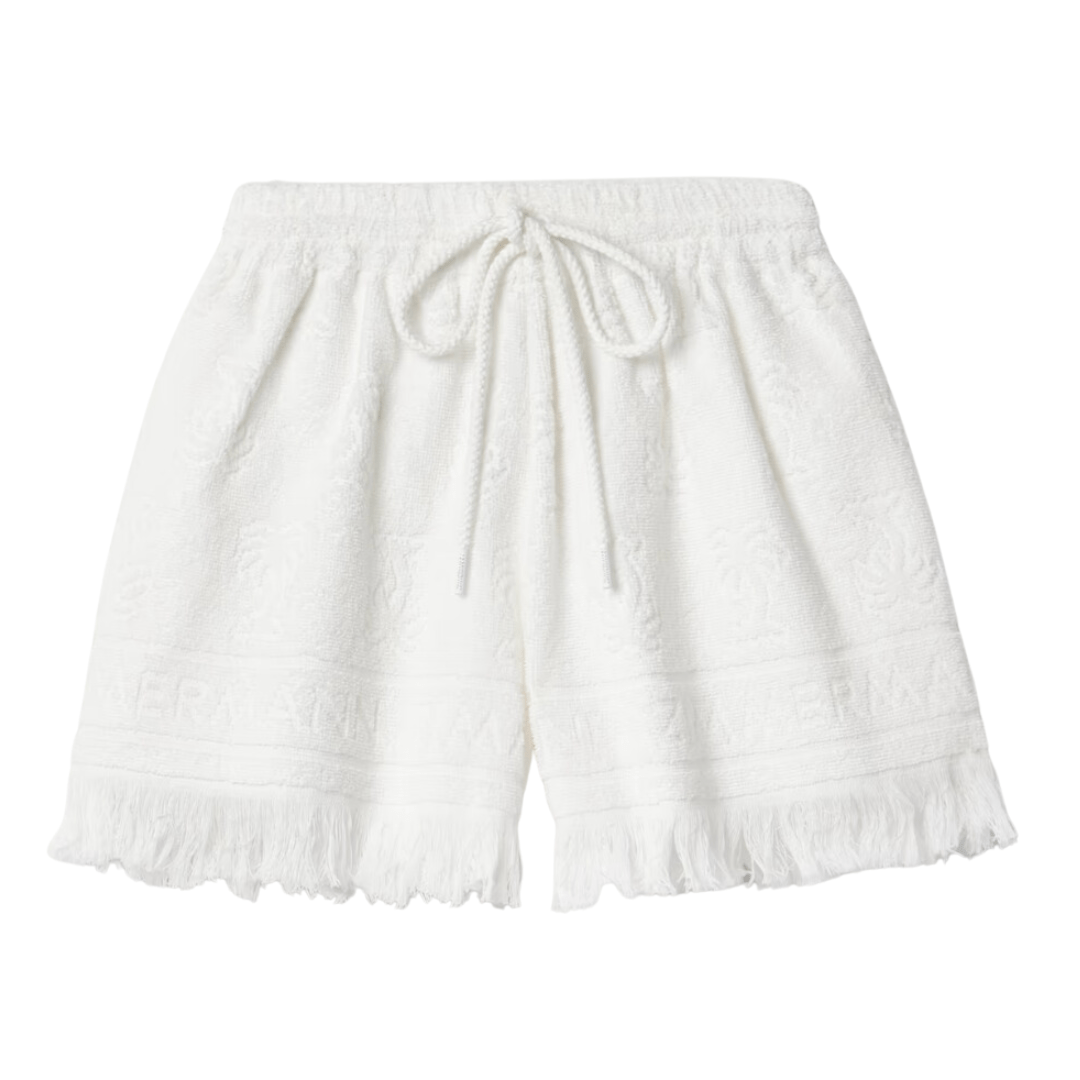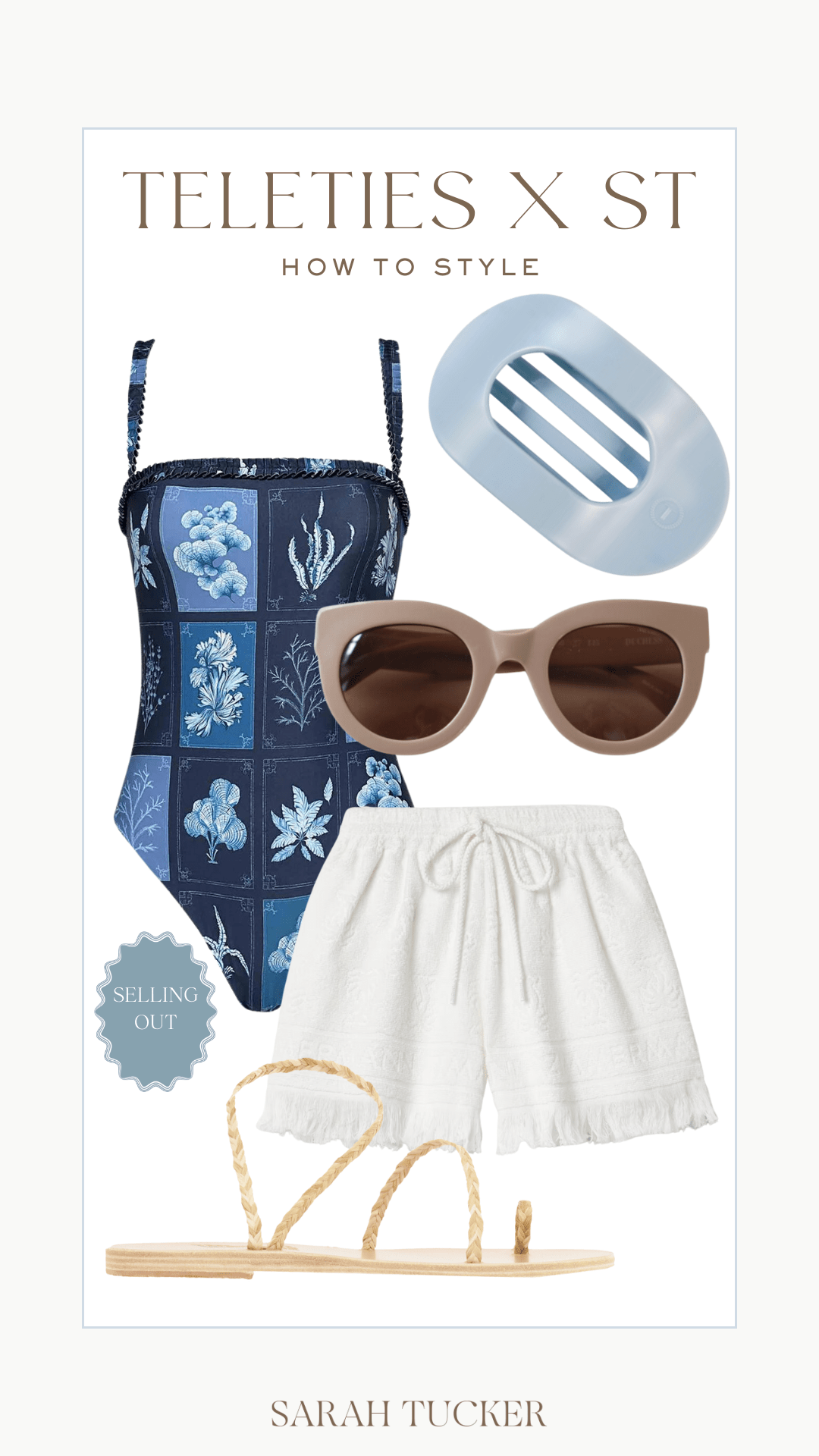 If you’re finalizing your spring break packing list, or just looking for a new flattering swimsuit to add to your collection, this one is so good! I love the beautiful colors and print, and the light blue open hair clip matches perfectly! Speaking of beautiful, I can’t get over the fringe details on these terry cloth shorts. Complete the look with a classic pair of sunnies and a favorite pair of sandals.