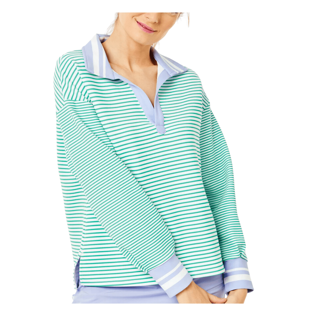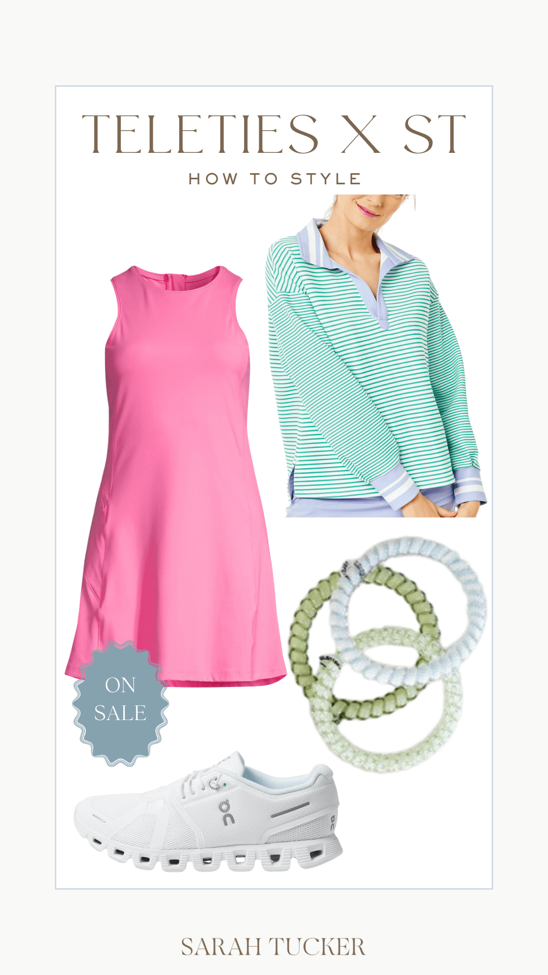 I constantly reach for these hair ties when wearing athleisurewear outfits. Clearly, this mixed pack would match pieces that are blue, green, or white, but I also love pairing them with other fun colors, such as pink, lavender, or coral. I own this pink tennis dress in other colors, and it’s so good (plus, it’s currently on sale!) And how cute is this green and periwinkle striped rugby shirt!? These OnCloud white sneakers are the perfect finishing touch to any activewear outfit.Â