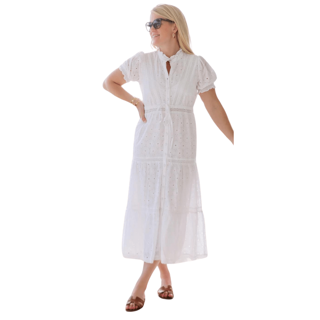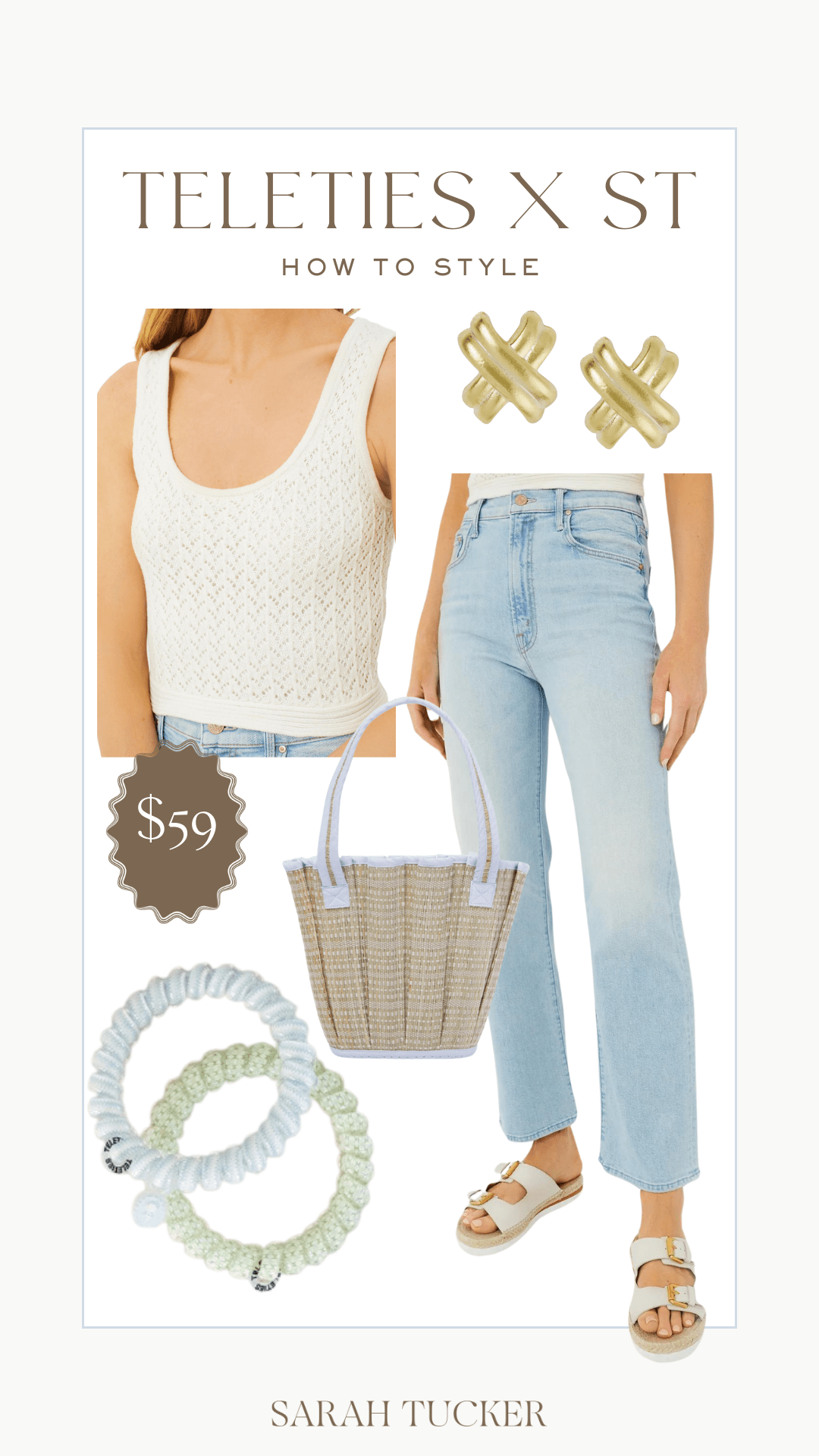 These blue and green Teleties also look great with a casual everyday outfit. I love the color of these high-rise straight jeans, and this adorable sweater tank is a Tuckernuck find for only $59! I would complete this look with a classic pair of gold stud earrings and a favorite tote bag from our Sail to Sable and Lorna Murray collection!